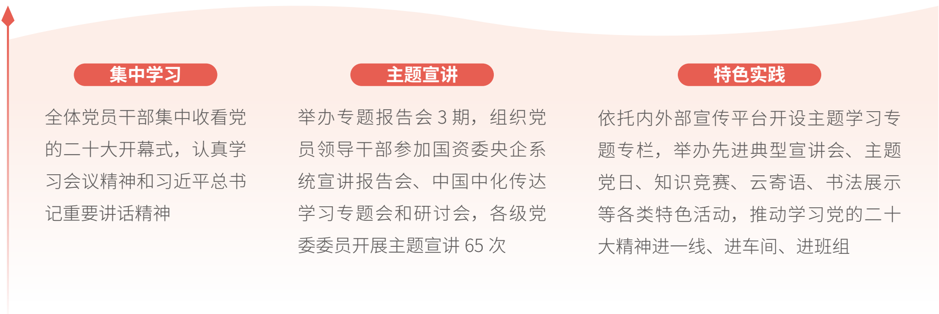 中化国际第一时间全面深入推进党的二十大精神学习宣贯,印发《学习宣传贯彻党的二十大精神工作方案》,通过专题学习、集中宣讲和特色实践等方式面向全员宣贯,用党的二十大精神凝聚思想共识,落实各项重大决策部署,以更加昂扬的精神状态和更高质量发展诠释好使命担当。