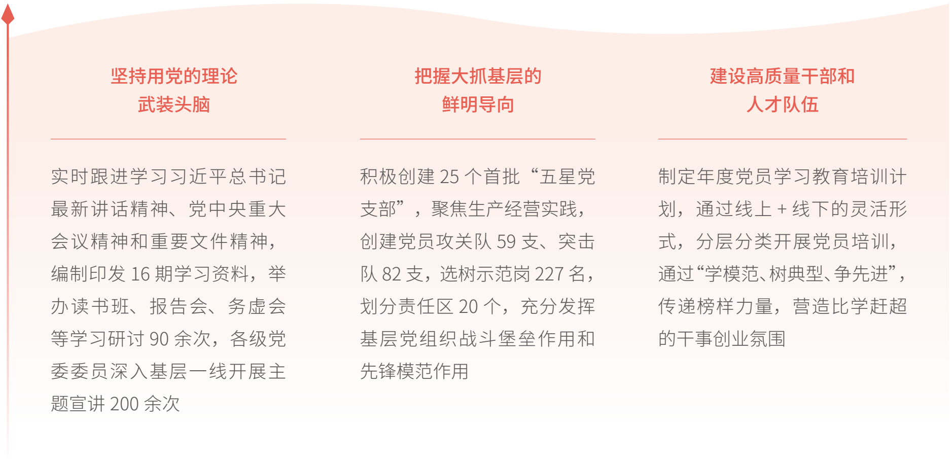 中化国际切实将党的领导和公司治理有机结合,落实好新时代党的组织路线,健全党的组织体系,建设高质量干部和人才队伍,以高质量党建引领企业高质量发展。