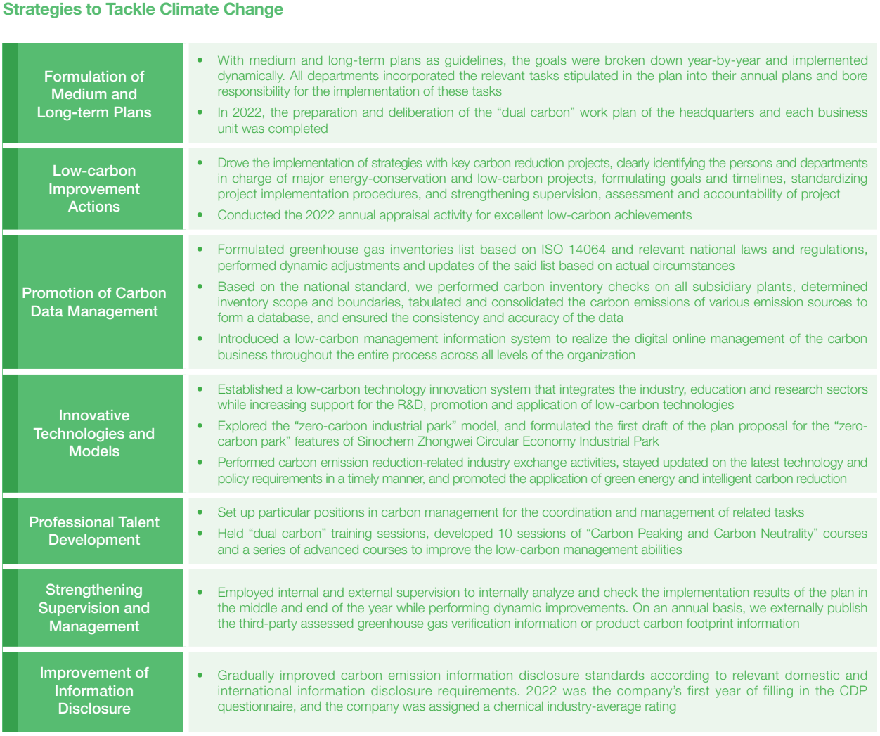 Sinochem International set climate change and carbon emission reduction goals, spelling out the corresponding responsibilities and plans in the annual performance scorecard. Energy conservation and carbon reduction components are included in the performance appraisal system for the persons-in-charge of the management team. The company regularly reviews the completion of carbon reduction targets, and promotes energy conservation and emission reduction through process upgrades, equipment upgrades, energy substitution, and recycling, to constantly upgrade green and sustainable competitive advantages.