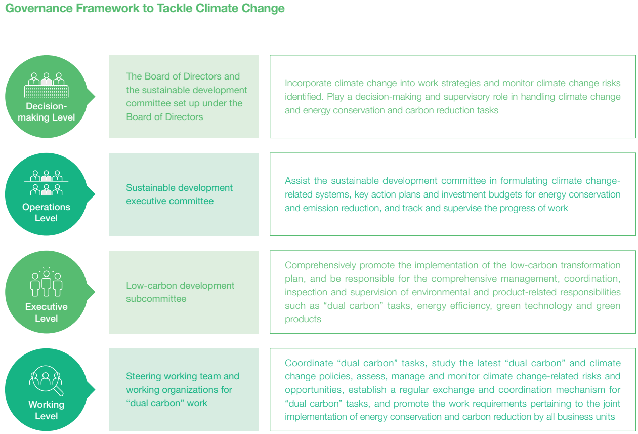 Sinochem International has incorporated climate change governance into the sustainable development governance framework, holding discussions based on the topic of “low-carbon development”. “Dual carbon” tasks are initiated by the top level and are performed in a top-down manner. The Board of Directors is responsible for the deliberation and supervision pertaining to the “dual carbon” action proposal, objectives, and implementation of measures.